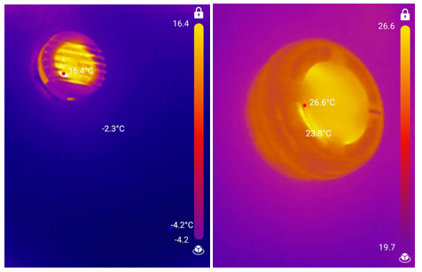 Termogramy z interiéru (obr. 2 a 3) ukazujú, že privádzaný vzduch je zohriaty na 23 – 27 °C. Pri nastavenej izbovej teplote 22 °C tak systém dopĺňa miestnosť príjemne teplým vzduchom. Vďaka medenému výmenníku sa zachováva nielen teplota, ale aj časť vlhkosti z odvádzaného vzduchu, čo je v zime dôležité na prevenciu vysušenia slizníc a statickej elektriny.