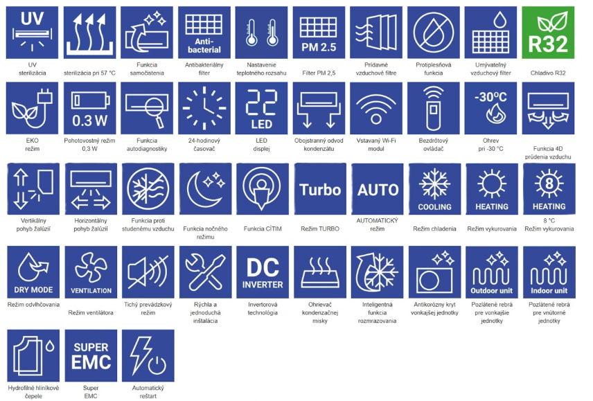 - Úspora energie: R32 s vyššou účinnosťou a nižším GWP; A+++ chl./A++ kúr.
