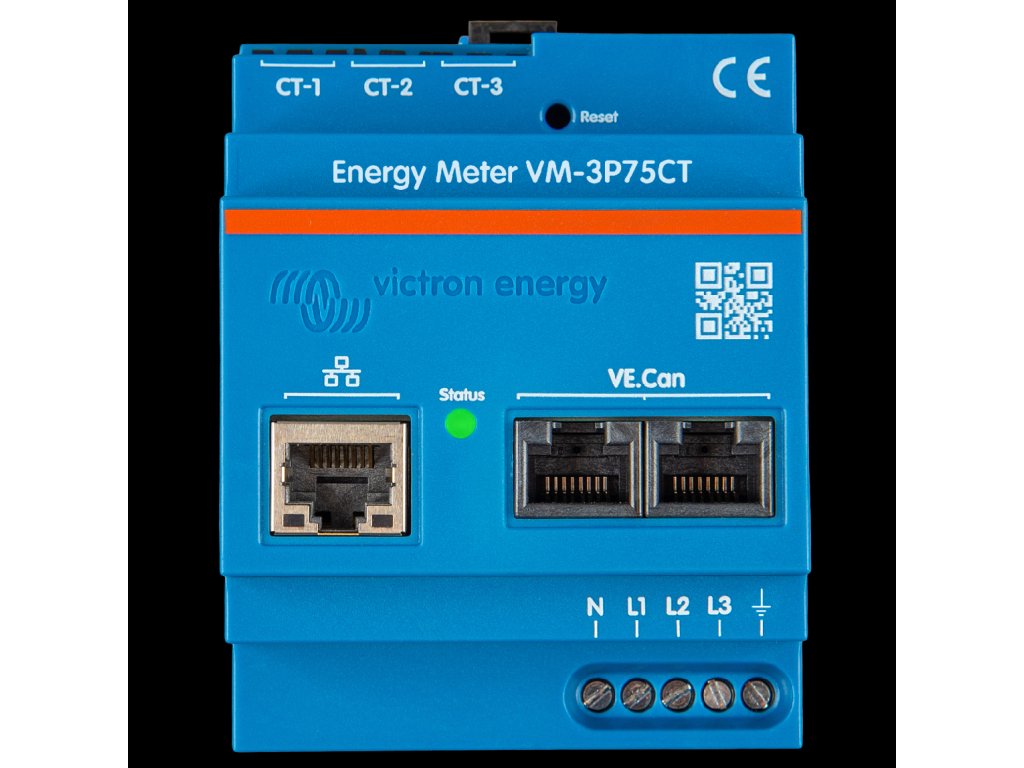 Merač VM-3P75CT je určený na meranie výkonu a energie jedno a trojfázových ESS systémov, alebo na meranie výkonu FV striedača, AC generátora alebo výkonu striedača a hybridného striedača. Má vstavané porty Ethernet a VE.Can pre pripojenie k zariadeniu GX a prúdové čidlá umožňujú jednoduchú a rýchlu inštaláciu bez úpravy existujúcej elektroinštalácie. Elektromer funguje ihneď po vybalení (Plug and play) ako sieťový merač pre väčšinu systémov. Konfigurácia (cez VictronConnect) je nutná iba pre zmenu role (Grid Meter, PV Inverter, AC Genset alebo AC Load Meter) a ručnú konfiguráciu IP. Dáta je možné zobraziť na zariadeniach GX, ako je Cerbo GX alebo Ekrano GX, a tiež vo VictronConnect a na portáli VRM.