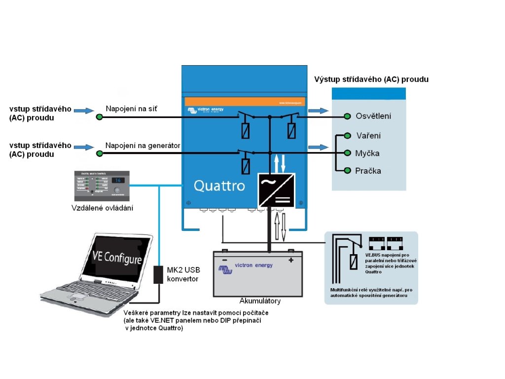 Quattro je vybavený dvoma navzájom nezávislými AC vstupmi (hlavný rozdiel oproti rade MultiPlus) ako sít a generátor alebo dva generátory. Zariadenie je schopné sa v prípade potreby automaticky pripojiť k zdroju, ktorý je práve k dispozícii.