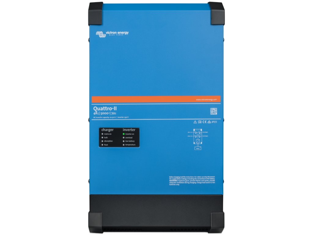 Podobne ako MultiPlus-II je Quattro-II taktiež kombinovaným zariadením, ktoré zahŕňa menič a nabíjačku. Okrem toho, ponúka dva AC vstupy a automaticky sa pripojí k aktívnemu zdroju.